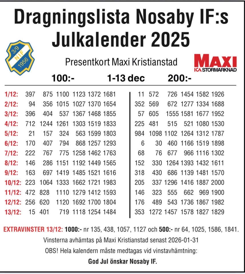 | 24 dec | Dragningslista Nosaby IF:s Julkalender 14-24 dec |