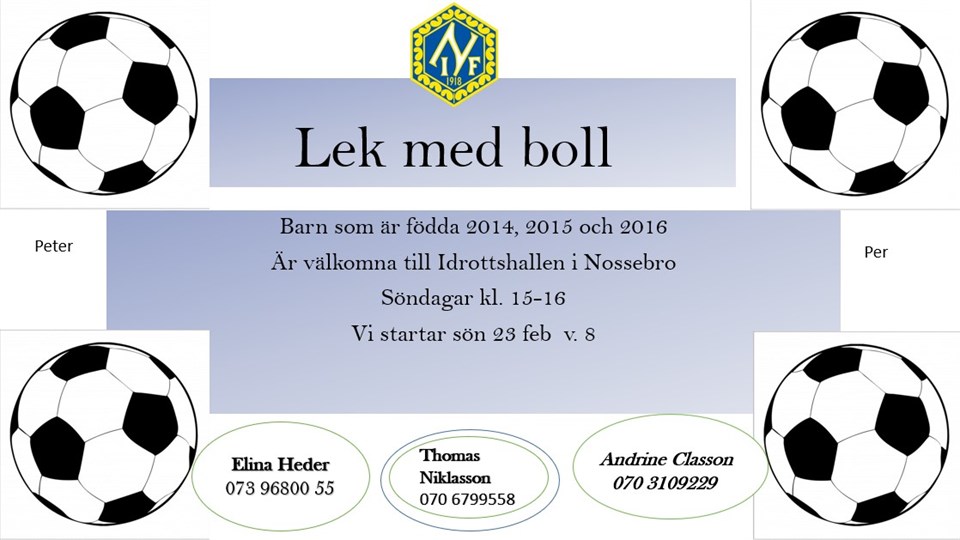 Nu startar vi igång vårens träningar i Lek med Boll, med träningsstart nu på söndag 23/2 kl. 15.00-16.00 i Idrottshallen i Nossebro. Alla barn födda 2014, 2015 och 2016 är välkomna! Med vänliga häslningar Ledarna Elina, Thomas och Andrine F-15/16 20 feb 2020 0kommentarer