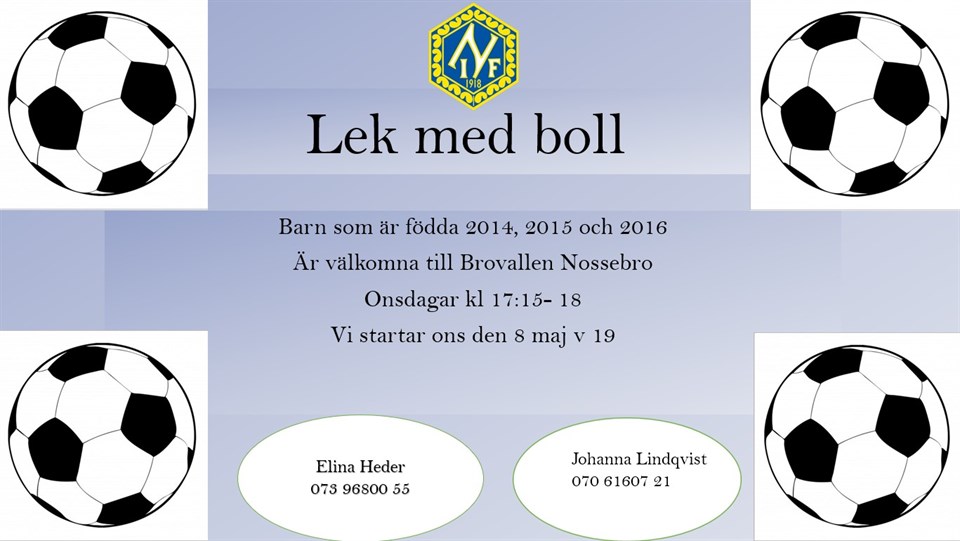 Barn födda 2014, 2015 och 2016 är välkomna till Brovallen i Nossebro för Lek med Boll. Onsdagar kl. 17.15-18.00 med start 8 maj. Med vänliga hälsningar från ledarna Johanna Almqvist 070-616 07 21 Elina Heder 073-968 00 55 F-15/16 28 apr 2019 0kommentarer