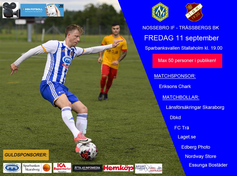Nu på fredag 11 September spelar NIF Herr hemma mot Trässbergs BK på Sparbanksvallen Stallahoms konstgräsplan kl. 19.00. Vi kommer att släppa in max 50 personer som publik enligt "Först till kvarn"-principen. Entré 50 kr. Läs mer här. Vi har ingen kiosk öppen på plats så ta gärna med eget fika om ni så önskar! Vi kommer att rapportera målen och resultatet som vanligt på Twitter - Klicka här. Vi kommer även att filma matchen via Min Fotboll - man kan se den på webben här eller ladda ner appen Min Fotboll för Andriod här och Apple iPhone/iPad här. Det kostar 29 kr att se matchen via Min fotboll. Delar av summan tillfaller NIF. Man är också välkommen att stödja NIF och Swisha valfri summa till Nossebro IF på Swish-nummer: 123 602 77 83. MATCHSPONSOR: Eriksons Chark MATCHBOLLAR: Nordway Store, Laget.se, Dbkd, FC Trä, Essunga Bostäder, Länsförsäkringar Skaraborg, Edberg Photo