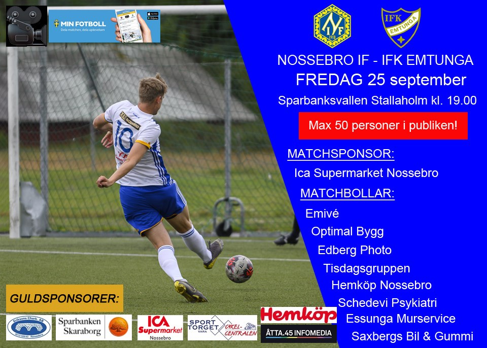 Nu på Fredag 25 september spelar NIF Herr A hemma mot IFK Emtunga på Sparbanksvallen Stallahoms konstgräsplan kl. 19.00. Vi kommer att släppa in max 50 personer som publik enligt "Först till kvarn"-principen. Entré 50 kr. Läs mer här. Vi har ingen kiosk öppen på plats så ta gärna med eget fika om ni så önskar! Vi kommer att rapportera målen och resultatet som vanligt på Twitter - Klicka här. Vi filmar inte matchen idag pga vädret. MATCHSPONSOR: Ica Supermarket Nossebro MATCHBOLLAR: Edberg Photo, Hemköp Nossebro, Schedevi Psykiatri, Saxbergs Bil & Gummi, Emivé, Optimal Bygg, Tisdagsgruppen, Essunga Murservice.