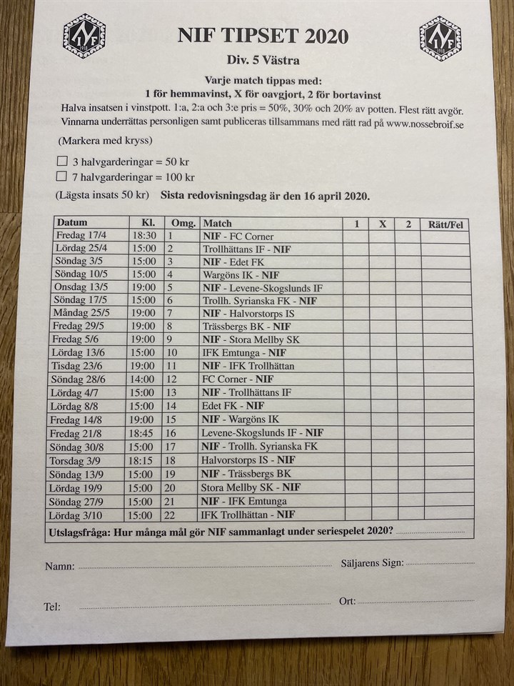 NIFs herrlag säljer nu det traditionsenliga NIF-TIPSET inför årets seriespel. Man kan köpa rad med 3 halvgarderingar för 50 kr eller 7 halvgarderingar för 100 kr. Tipset säljes av alla spelare i NIFs herrlag fotboll samt av Patrik Svensson, 070-237 86 66. Man kan köpa NIF-TIPSET fram t.o.m. avspark för första seriematchen den 17 april. Herr A/U 15 mar 2020 0kommentarer