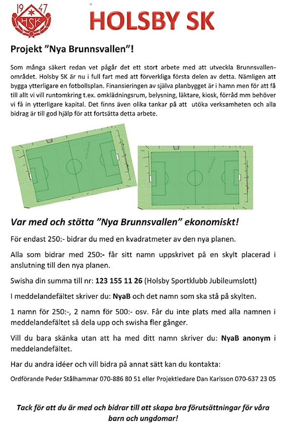 Som många säkert redan vet pågår det ett stort arbete med att utveckla Brunnsvallenområdet. Holsby SK är nu i full fart med att förverkliga första delen av detta. Nämligen att bygga ytterligare en fotbollsplan. Finansieringen av själva planbygget är i hamn men för att få till allt vi vill runtomkring t.ex. omklädningsrum, belysning, läktare, kiosk, förråd mm behöver vi få in ytterligare kapital. Det finns även olika tankar på att utöka verksamheten och alla bidrag är till god hjälp för att fortsätta detta arbete.
