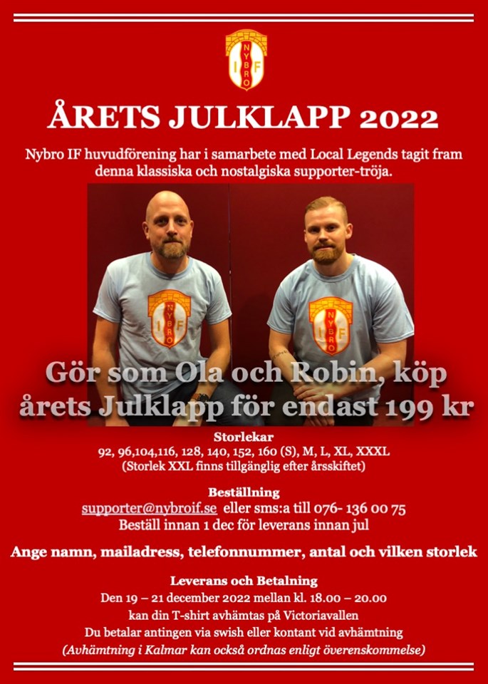 Nybro IF har tillsammans med Local Legends tagit fram en fantastisk supporter T-shirt i retrostil. Ta chansen och köp denna nostaligiska T-shirt för endast 199 kr. Beställning sker via supporter@nybroif.se eller sms till 076-1360075 Ange namn, mailadress, telefonnummer, antal och storlek Beställ innan 1 december för leverans innan jul En underbar julklapp! P-2011 18 nov 2022 0kommentarer