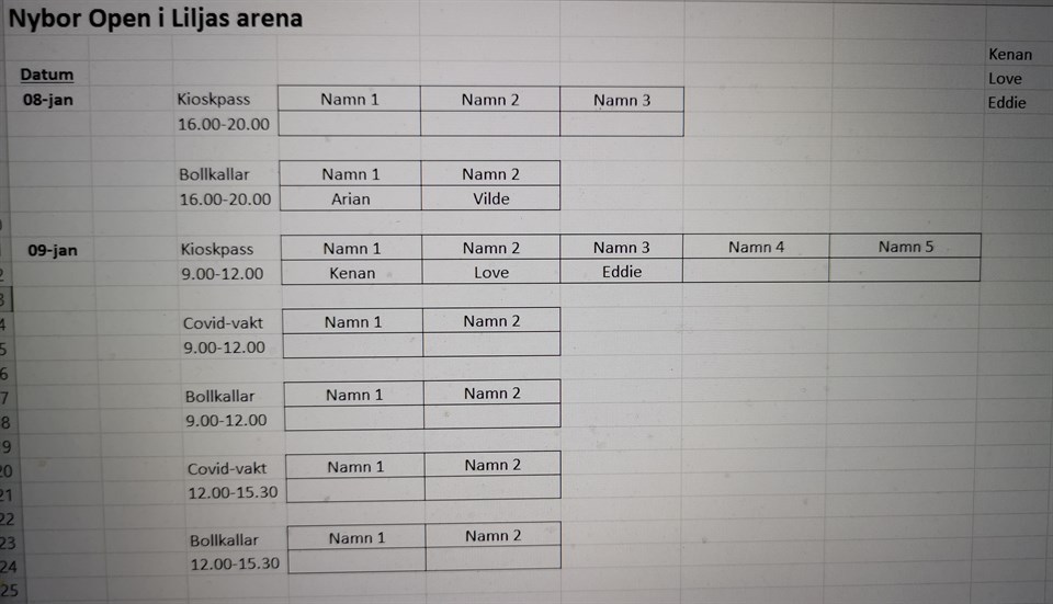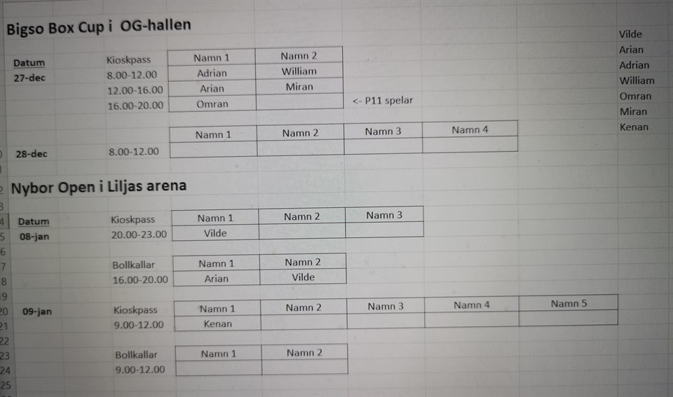 Hej! Idag skickar jag ut kallelser till alla som vill vara med i vår egen inomhus cup, Bigso Box, den 27 december. Alla som vill får vara med och spela men då åtar man sig också att ställa upp på ett kioskpass. Vi är väl medveten om att alla inte är sugna på att bemanna cupens kiosker, men det är nödvändigt med ideellt arbete för att föreningen skall få in sina pengar. Föreningen har bestämt att spelarna inte skall behöva sälja något, ex. Newbody, lotter eller övrigt, för att få in pengar till föreningen så detta är det som Ni föräldrar måste hjälpa till med för att föreningen skall fungera ekonomiskt. Vi har blivit tilldelade tider under två dagar på Bigso Box (27-28/12) och två dagar på Nybro Open (8-9/1). Jag bifogar en bild där kiosktiderna framgår och i samband med att ni anmäler ert barn i kallelseutskicket så skriver ni även upp er på ett av passen på bilden. Ni skriver upp er i kommentarsfältet nedan och tilldelning sker enligt "först till kvarn". Med vänliga hälsningar Ola