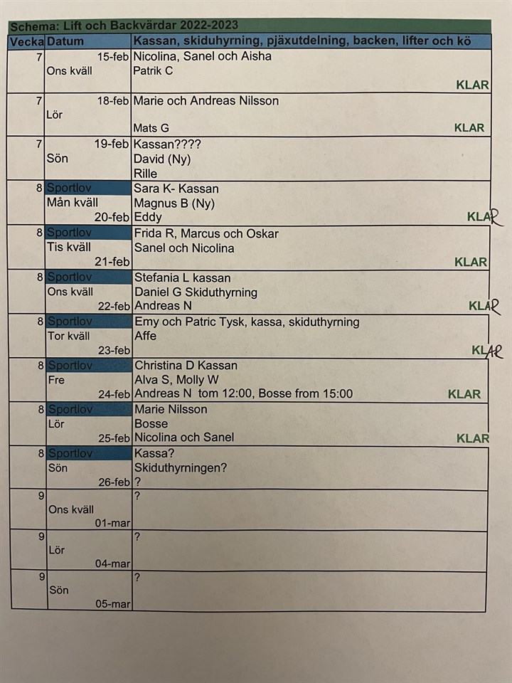 Hej på er Lift-och Backvärdar😀 Nu är det åter dags att få ihop säsongens ”Liftvärds-schema. Schemat kommer uppdateras efter hand i sms-gruppen och via laget.se. Länk till liftschema Officiell öppning av backen blir Annandag jul (Tis 26/12) kl 10:00-16:00. Vi kommer låta de nya lift- och backvärdarna vara tillsammans och hjälpa till med de som varit med tidigare och som har lite rutin, så det blir en bra upplärning för de nya. Som tidigare år är det onsdagskvällar samt lördagar och söndagar som backen är öppen, några extra dagar under sportlovet och förhoppningsvis även hela sportlovet. Vi rekommenderar att man är i backen ca en timma innan vi öppnar för allmänheten, så man hinner med att kontrollera liftarna, nödstoppen och ställa i ordning saker i lifthuset. Nytt för i år är att vi har nya kassaparater som vi behöver lära oss😊 Vi har även bytt ut liftkorten mot armband. Denna säsong ska vi bli bättre på att kontrollera skidåkarna i liftköerna så de har betalat och har sitt band runt armen. Vi tänker oss att någon av oss värdar ställer sig vid någon liftkö 30-60 min när det passar under dagen och gör en kontroll. Det är bra om vi är minst 8 st lift-och backvärdar så här i uppstarten sen klarar vi oss på 6 st om det är lagom med folk i backen. Meddela mig gärna redan nu när ni har möjlighet att hjälpa till i vinter eller om ni har fler som ni känner som kan vara liftvärdar i vinter. Önskar er alla en God Jul 🎄 Mvh Marie Marie Nilsson 073-8255898 miafia.ni77@gmail.com