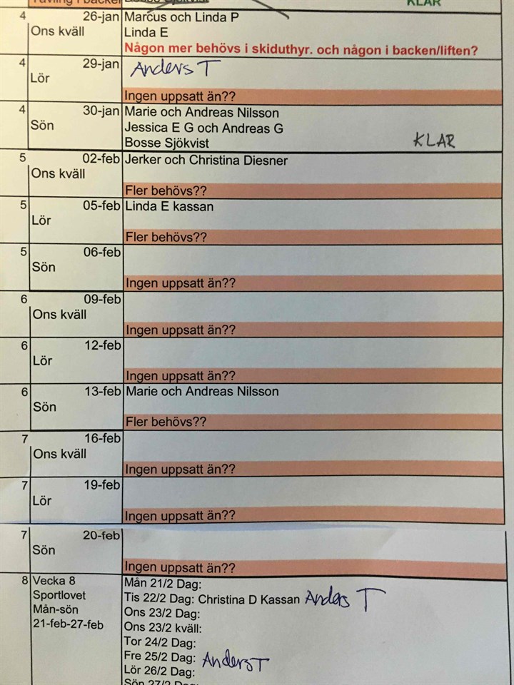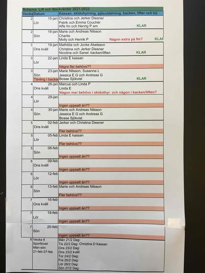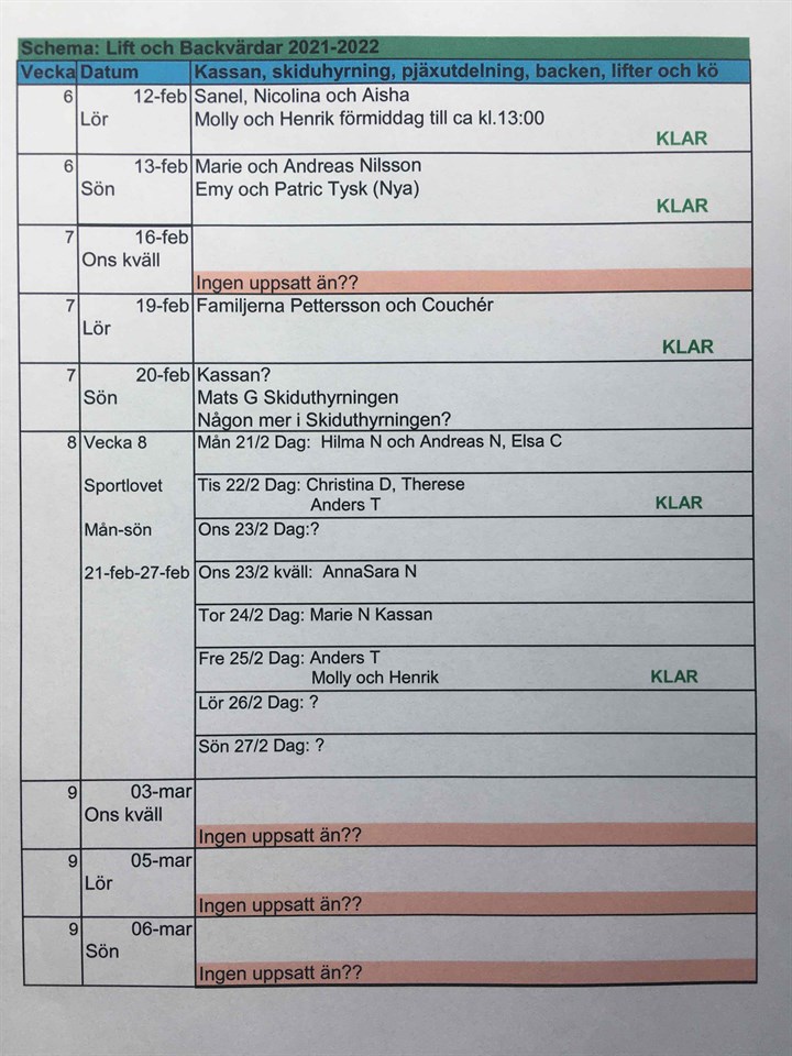 Schemat uppdaterat. Vi behöver någon till i skiduthyrningen på onsdag samt några som hjälper till på lördag 29/1. Liftvärdar 23 jan 2022 8kommentarer