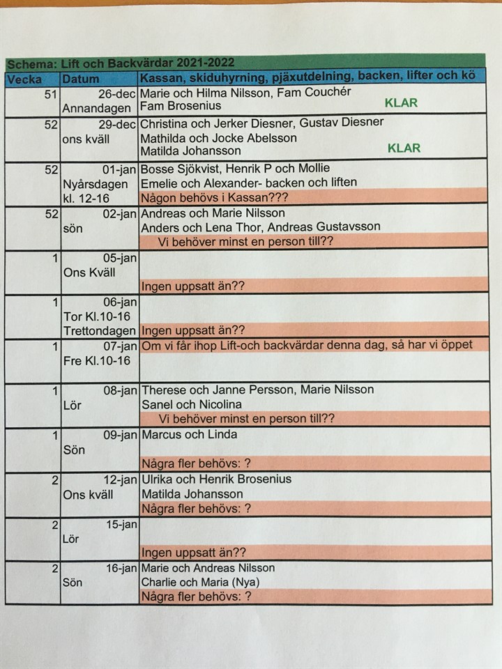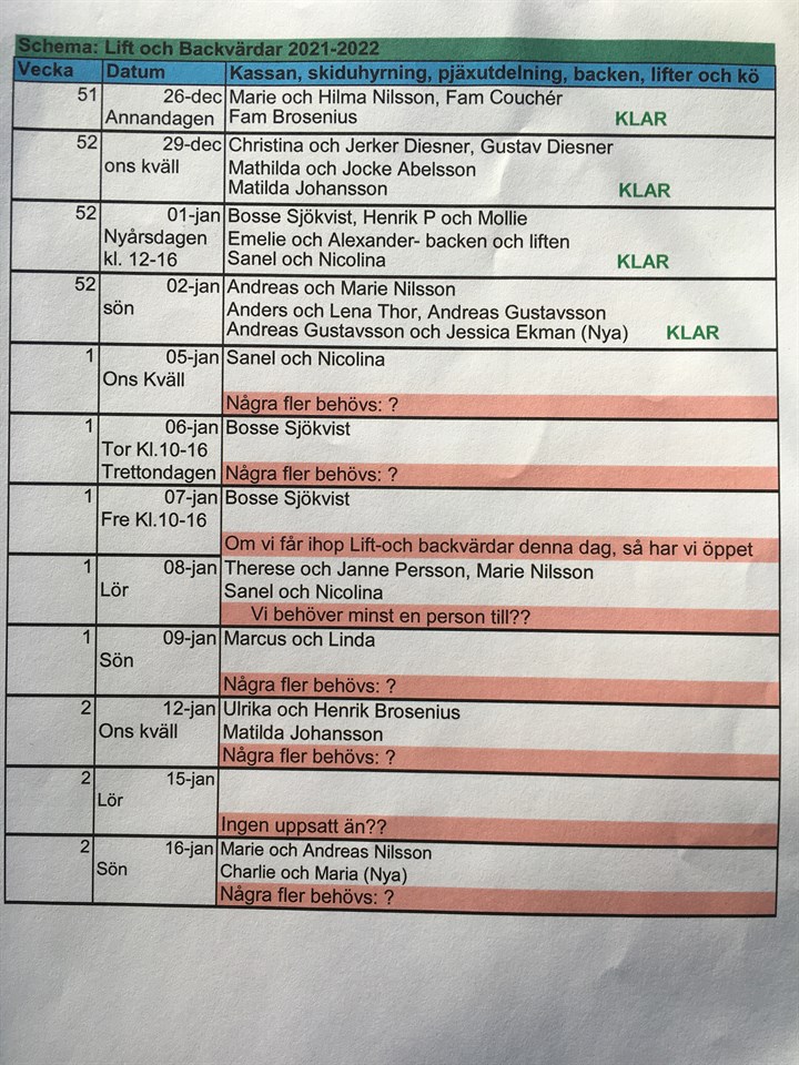Hej Här kommer en Uppdaterad lista. Vi behöver någon som bland annat hjälper till i kassan på Nyårsdagen. Med vänlig hälsning, Marie Nilsson 073-8255898 Liftvärdar 21 dec 2021 0kommentarer