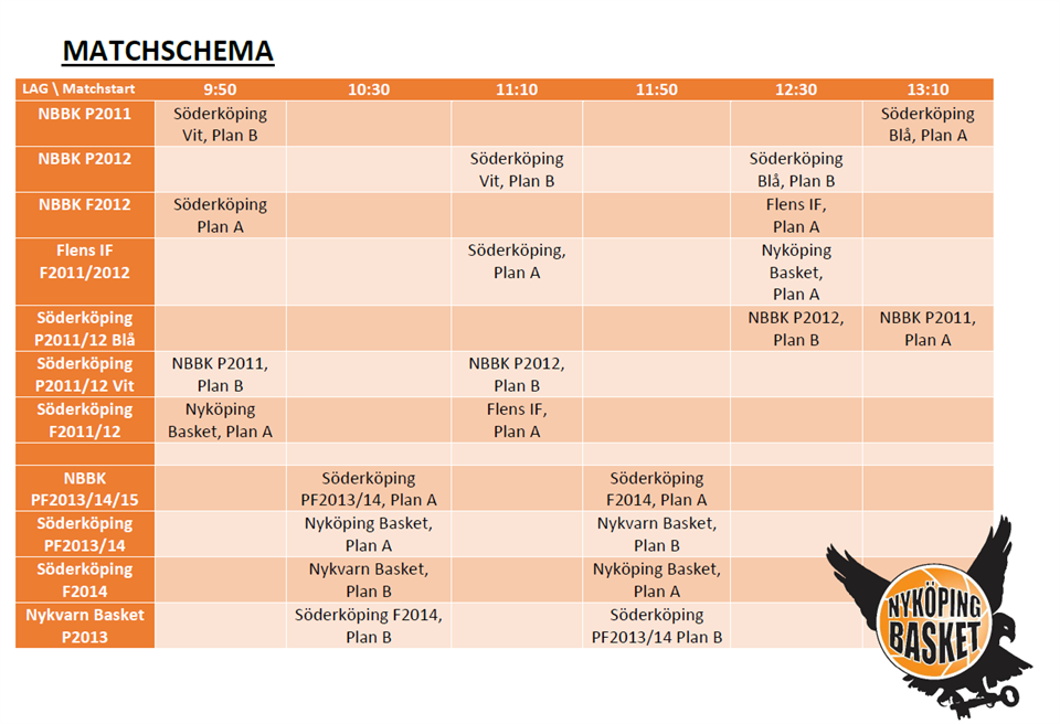 Hej! Här kommer spelschemat för våra matcher i Sporthallen! Jag hoppas att ni tycker att det ska bli spännande! Ta med inomhusskor och vattenflaska. Laget kommer få låna matchställ av NBBK, men ibland kan det vara smart att packa med sig idrottskläder i reserv. Eftersom den första matchen börjar 10:30 så kan vi samlas klockan 9:45. Jag kommer att ha en del att förbereda, men mina hjälptränare kommer att hjälpa alla att få på sig rätt kläder och komma till rätt plan! Som jag skrev innan så kommer vi inte att räkna poäng på våra matcher, utan fokus kommer att ligga på att ha roligt och att göra sitt allra bästa. Det brukar bli en stark tävlingskänsla även om vi inte fokuserar på resultat utan på prestation. Som föräldrar i Nyköping Basket så förväntar jag mig att ni bidrar till en positiv stämning i hallen. Ni får mycket gärna ge barnen positiv förstärkning och heja på, men jag vill be er att inte vara kritiska eller komma med för mycket "tips" på planen. Jag kommer absolut inte tillåta att våra föräldrar klagar på domare eller på spelare. Jag är inte så orolig, det brukar aldrig vara något problem, men jag vill ändå säga det i förväg så att alla vet vad som förväntas. Det ska bli mycket roligt att spela med er, vi ses på torsdag och på lördag! MVH Coach Hannes