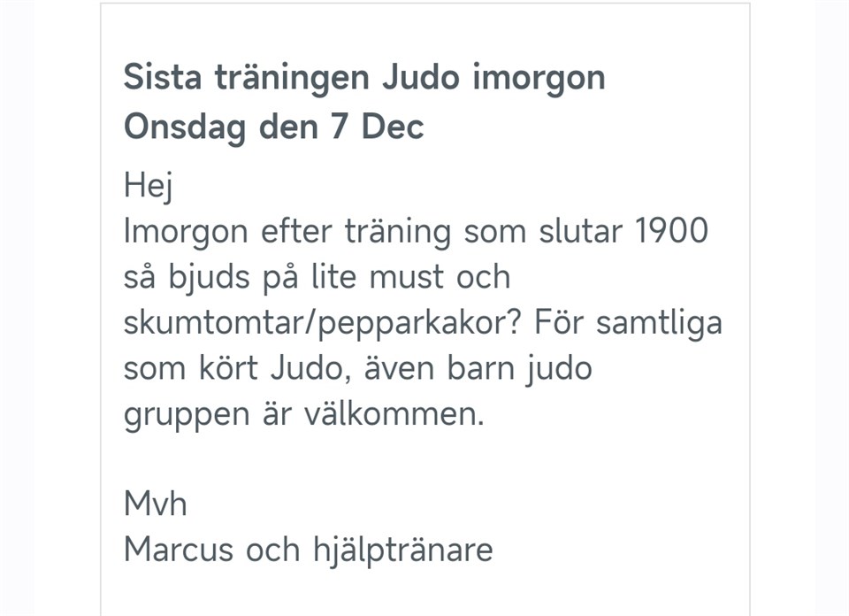 Sista judotrĂ€ningen pĂ„ onsdag (imorgon 7 December) för terminen, och att trĂ€ningspasset som kommer vara, slutar 19 och att det dĂ„ bjuds pĂ„ lite must och skumtomtar/pepparkakor? För samtliga som kört Judo, Ă€ven barn judo gruppen alltsĂ„. Mvh Marcus och hjĂ€lptrĂ€nare Nyköpings Bushidoförening 6 dec 2022