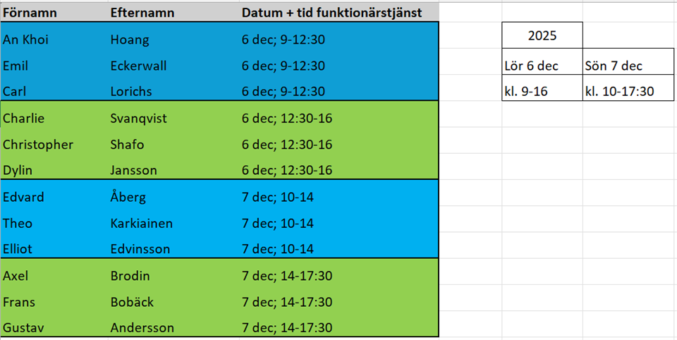 Ni hittar under dokument här på hemsidan nu en mapp som heter just Funktionärstjänst. I den finns schema samt instruktioner. I schemat har vi placerat tränarnas barn längst ner och rödmarkerat, detta för att i första hand inte få med oss till funktionärsroller, därefter har vi bara lagt in laget rakt upp och ner och utgått från det. Förhoppningsvis syns de som tilldelats pass denna gång i ovan bild utöver schemat i mappen bland alla dokument.