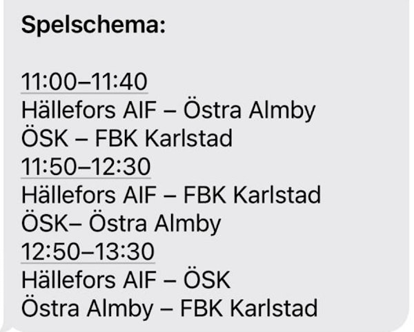 Pga sent avhopp har tiderna justerats inför morgondagens matcher. Se bifogat spelschema. Förstår att det kan ställa till det för många men försök att vara på plats ca 20 minuter innan för att få matchtröja och värma upp.