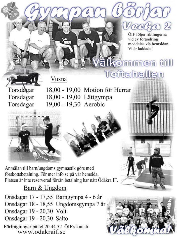 Välkommen till en ny termin i Toftahallen Herrgympa torsdagar 18,30 - 19,30 Lättgympa torsdagar 18,30 - 19,30 Aerobic torsdagar 19,30 - 20,00 Välkomna! Dam och Herr gymnastik 15 aug 2022 0kommentarer