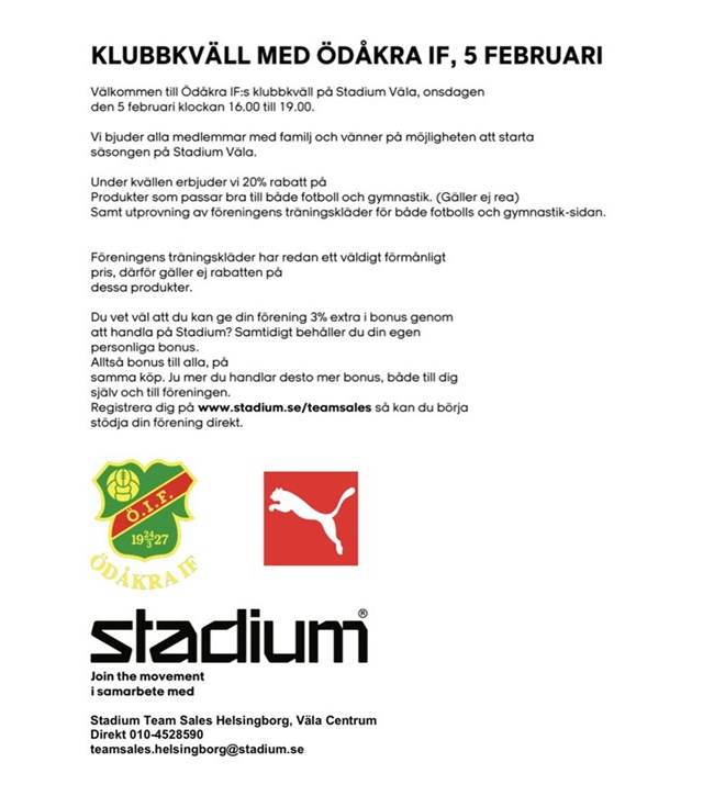 Välkommen till föreningens klubbkväll hos Stadium, Väla den 5 februari mellan kl.16.00-19.00 /Ödåkra IF Senior Herr 3 feb 2020 0kommentarer