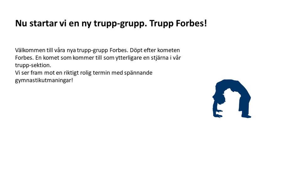 Nu startar vi en ny trupp-grupp. Trupp Forbes! Välkommen till våra nya trupp-grupp Forbes. Döpt efter kometen Forbes. En komet som kommer till som ytterligare en stjärna i vår trupp-sektion. Vi ser fram mot en riktigt rolig termin med spännande gymnastikutmaningar! Trupp Bas Mörkgul 15 aug 2021 0kommentarer