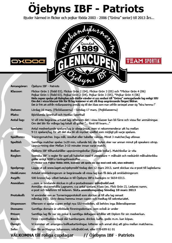 Hej F04, Här kommer en inbjudan till Glenncupen som arrangeras för 24 året i följd. 16 mars går den av stapeln och vi vill ju självfallet se våra egna lag medverkande. OBS! Cupen är föreningens "egen" och föräldragrupper i respektive lag ställer upp som funktionärer för föreningens räkning. Mer information om detta kommer senare. // Cupgruppen, via Magnus Johansson