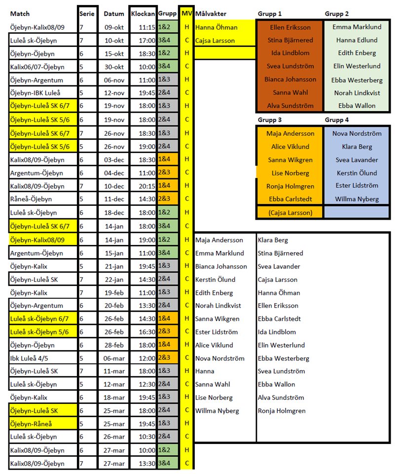 Lördag 9/10 Norrmalmia, grupp 1&2 och målvakt Hanna. Samling 10:15. Sekretariat och Fika grupp samling 10:00. Söndag 10/10 Hertsön Luleå, grupp 3&4 målvakt Cajsa. Samling 16:15 Om ni inte kan spela så måste ni höra av er till någon ledare i god tid.