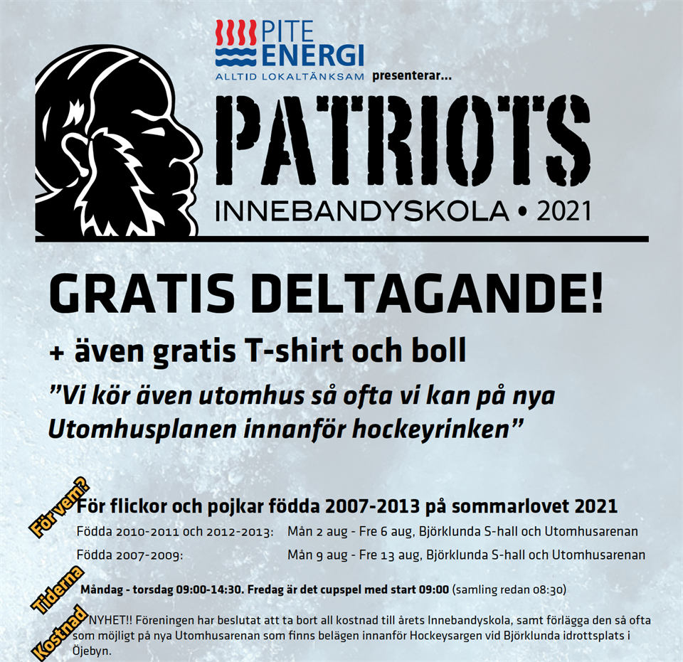 Anmälan till 2021 års "Patriots Innebandyskola" har nu öppnat. Vecka 31 (Mån 2 - Fre 6 augusti): Flickor & pojkar födda 2010-2011 och 2012-2013 Vecka 32 (Mån 9 - Fre 13 augusti): Flickor & pojkar födda 2007-2009 Gör din anmälan Online här: https://forms.gle/4vvMBCmE8gVh6zcw9 Mer information hittar du på vår Webbsajt: https://www.laget.se/patriotsinnebandyskola Vår samarbetspartner är som tidigare år fantastiska PiteEnergi Välkomna in med din anmälan 💙