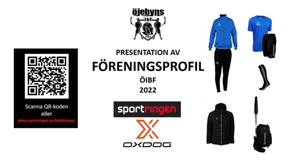 Klubbvecka nummer 1 har startat Denna första klubbvecka pågår mellan måndag 22 augusti till söndag 28 augusti och gäller när Sportringen i Piteå har sina öppettider för att pröva ut kläder på plats. Beställningarna görs med fördel via Onlinebutiken enligt nedan. Spelarnas kläder • Blå träningstischa • Svarta träningsshorts • Svarta strumpor • Blå träningsoveralltröja med hoodie (X-Hood) • Svarta träningsoverallbyxor Ledarnas kläder • Svart ledarpiké (varje ledare som inte har fått tidigare erhåller en gratis) • Svart träningsoveralltröja med hoodie (X-hood) • Svarta träningsoverallbyxor Sen går det såklart att beställa extra svarta och blå saker också som Spelare och Ledare men ovanstående är föreningsprofilen. Övrigt • Utomhusjacka, Svart (Fenix Padded Jacket) • Inomhusjacka, Blå (Speedjacket) • Ryggsäck med klubbfodral För att beställa och se alla erbjudanden scanna in QR koden eller besök Sportringens Webbsida för Öjebyns IBF online Vid frågor kontakta oss på Facebook eller via Mejl Välkomna till den nya säsongen hälsar styrelsen och sektionerna.