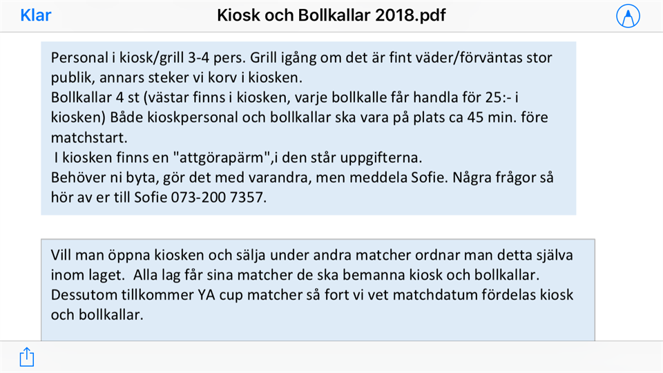 Hej på er! Vi har ännu inte datum för oktoberfesten, så vi har inte gjort en samlad översikt över våra åtaganden. Nu kom dock kioskpass och bollekalleuppdrag och P-05 är först ut, så det är lite bråttom: 19 april 18.30 Öja FF-Spjutstorp kiosk och bollkallar 20 juni 19.00 Öja FF-Köpingebro enbart bollkallar 15 sep 14.00 Öja FF-Hammenhög enbart bollkallar Vem kan ta sig an detta? På bilden kan ni läsa vad som förväntas av er. Hör av er till mig via sms. 0709-928652 Hälsar Sofia