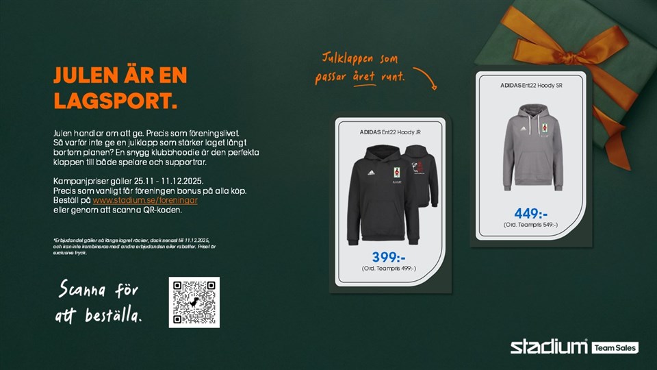 Julen handlar om att ge – precis som föreningslivet. Varför inte ge en julklapp som stärker laget långt bortom planen? En snygg klubbhoodie är den perfekta gåvan till både spelare, ledare och supportrar. Nu erbjuder vi er kampanjpris på utvalda hoodies från adidas Kampanjperiod: 25 november – 11 december 2025 Priserna gäller så långt lagret räcker och kan inte kombineras med andra erbjudanden eller rabatter. Knatte 27 nov 2025 0kommentarer