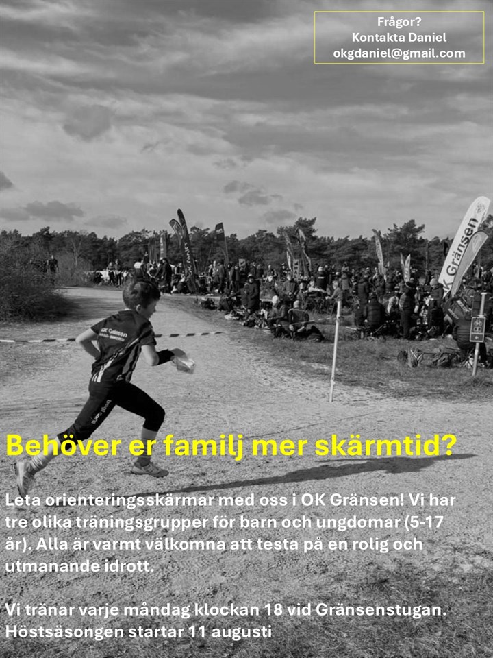 Måndagen den 11 augusti drar vi igång med våra träningar vid klubbstugan. Barn och ungdomar utgår alltid från Gränsenstugan klockan 18. Vi kör tre olika grupper och oftast åker orange grupp iväg. På torsdagar från 14 augusti kommer vi träna orientering framtill sista torsdagen i september. Vi kör då tre olika grupper på samma träning. Gul/orange för ungdomar, vuxna samt nybörjarträning för vuxna. Den 14 augusti utgår vi från Gränsenstugan klockan 18.30. denna kväll är det dessutom Klubbmästerskap i medeldistans. Tillfälle två den 21 augusti utgår träningen från sorteringen i Fagerhult.