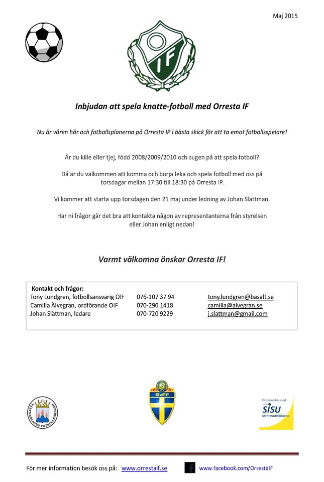Nu är våren här och fotbollsplanerna på Orresta IP i bästa skick för att ta emot fotbollsspelare! Är du kille eller tjej, född 2008/2009/2010 och sugen på att spela fotboll? Då är du välkommen att komma och börja leka och spela fotboll med oss på torsdagar mellan 17:30 till 18:30 på Orresta IP. Vi kommer att starta upp torsdagen den 21 maj under ledning av Johan Slättman. Har ni frågor går det bra att kontakta någon av representanterna från styrelsen eller Johan enligt nedan! Kontakt och frågor: Tony Lundgren, fotbollsansvarig OIF: 076-107 37 94, tony.lundgren@basalt.se Camilla Älvegran, ordförande OI: 070-290 1418 camilla@alvegran.se Johan Slättman, ledare: 070-720 9229 j.slattman@gmail.com Varmt välkomna önskar Orresta IF!