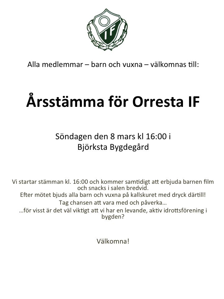Nu är det snart dags för dig att göra din röst hörd! - Vad kan vi förbättra i föreningen? - Vad gör vi bra? - Vad ska vi fortsätta med? - Vad ska vi sluta med? - Vad ska vi börja med? Välkommen på Orresta IF årsstämma 2015 söndagen den 8 mars kl 16.00 i Björksta bygdegård