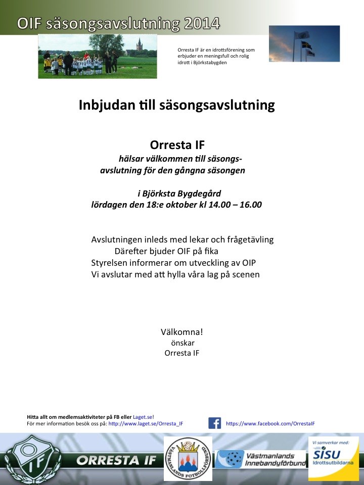 OIF inbjuder alla medlemmar till säsongsavslutning i Björksta bygdegård lördagen den 18 oktober kl 14.00 - 16.00. Välkommen!