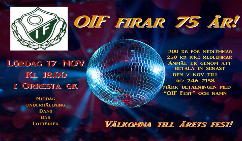 Kom ihåg att anmäla er till OIFs jubileumfest som går av stapeln den 17/11 kl 18:00 i Orresta Golfklubb. Middag, underhållning, band, dans, bar, lotterier mm 200:- för medlemmar, 250:- för icke medlemmar Anmäller genom att betala in senast den 7/11 på BG 246-2158, Märk betalningen fest och ert namn Välkomna!! Festkommittéen