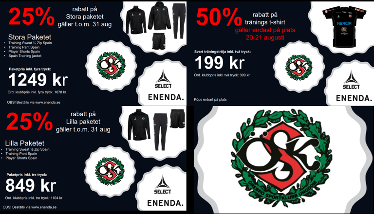 Vi vill påminna om att det är paketpriser nu i slutet av augusti och tryck ingår! Det finns "Lilla Paketet" eller "Stora Paketet". Precis som de tidigare tillfällena ingår inte längre den svarta träningströjan, men den finns även vid detta tillfälle till extrapris med 199 kr inklusive tryck! Det priset gäller enbart på plats (skicka någon annan om ni själva inte kan närvara). Även för handbollen är det den svarta tröjan som är till extrapris då vi så småningom kommer att byta till vita träningströjor. Utprovningskvällar: Tisdag och onsdag den 20-21 augusti klockan 17:00-19:30 Tisdagen är i första hand till innebandyn och onsdagen i första hand till handbollen, men det går bra att komma vilken av kvällarna som helst och även Datum: 20-21 augusti Tid: 17:00-19:30 Plats: Klubbhuset, Landbotorpsallén 58 Paketpriserna gäller från 20-31 augusti via enenda.se. Träningströjans priser gäller 20-21 augusti i klubbhuset. Enenda och Select finns där och strumpor kommer att säljas på plats.