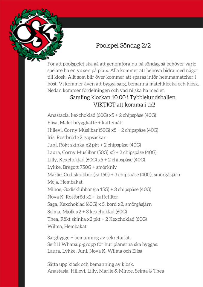 Hej! Lördag 7/12 klockan 13.45 möter vi Ekeby IF 2015. Samling 13.00. Som det ser ut just nu så är det inte någon match innan oss, utan vi ska precis som sist bygga upp sarg, ställa ut avbytarbänkar, få igång matchklockan, få upp en kiosk. Viktigt att efter vi haft uppvärmning med boll att ALLA bollar samlas in, då vi har köpt in egna bollar till endast vårt lag (vi har delat med alla innebandylag i Navet tidigare). Så någon får gärna ta ett varv runt i hallen och se till att alla bollar samlats in. Någon får också gärna i periodpauser komma och hämta vattenflaskor av tjejerna och fylla upp, många som druckit upp sitt vatten inför sista perioden. - Bygge av sarg, avbytarbänk, 2x mål. - Fylla vattenflaskor i periodpaus - Samla in bollar - Matchklockan (finns en pedagogisk förklaring hur man ställer in klockan och klockan stoppas endast vid mål och time-out, inte någon resultatstatistik) - Kiosk. Kaffe, Festis, något bakat, mjölk, servetter, muggar, socker/suketter, kexchoklad, gärna andra godisbitar, kiosk-meny och swishskylt. Kommentera gärna nedan så vi vet vem som ansvarar för vad.