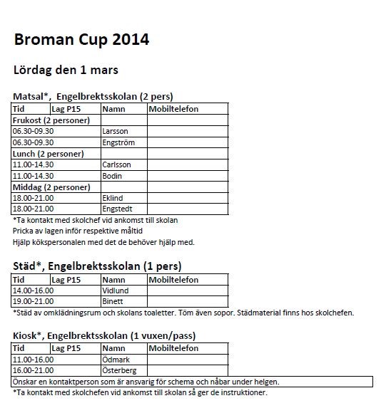 Nu finns schema för våra arbetsuppgifter under Broman Cup under flik dokument. Vi ska arbeta på Engelbrektsskolan lördag 1/3. Var och en ansvarar själv för att byta pass om det inte fungerar. I matsal och städ kan ungdomarna själva arbeta, om det passar- en del killar kommer även att döma under turneringen. I kiosken ska det vara en vuxen med. B-P99/00 (P18) 21 feb 2014 0kommentarer