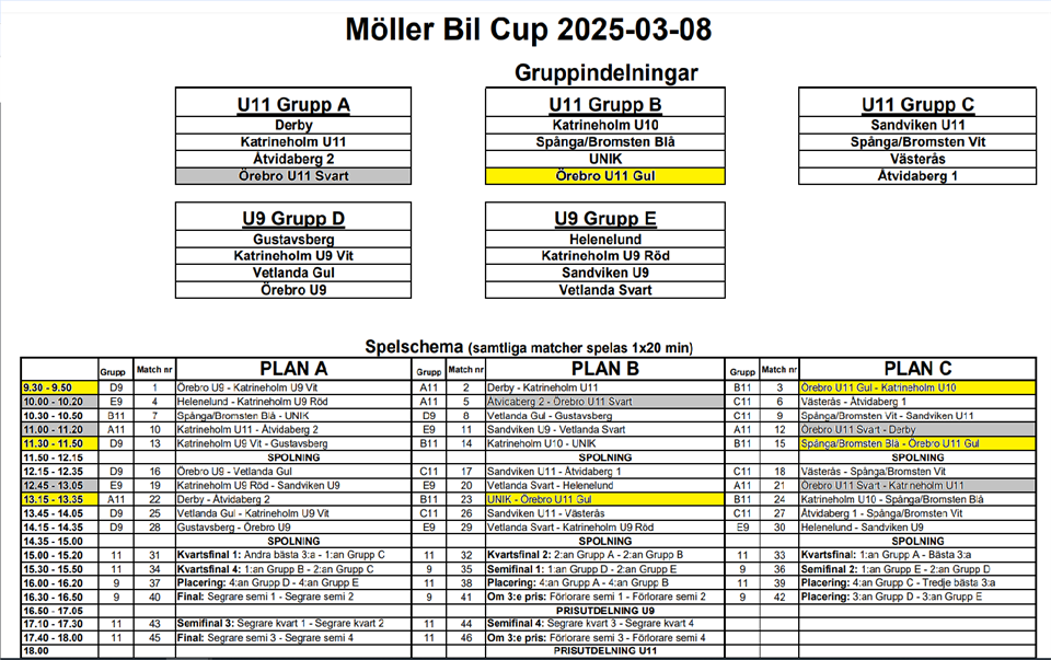 Hej! Nu är det dags för säsongens sista matcher. Matcherna spelas 1x20 minuter. Det är tre 4-lagsgrupper där ettan och tvåan + de två bästa treorna går till kvartsfinal. Övriga lag spelar placeringsmatcher. Lagindelning sker på plats. Det kommer grillas hamburgare utanför ishallen vid huvudentrén. Även en kiosk uppe i hörnet på läktaren kommer finnas. Här är en länk där löpande resultatuppdatering kommer att ske under cupen: https://www.cupsupport.se/cup/visa_cscupspel.php?Cupnr=9372 Vi ses i Katrineholm på lördag 8.30 i Kronfågel isarena! Heja ÖSK! 💛