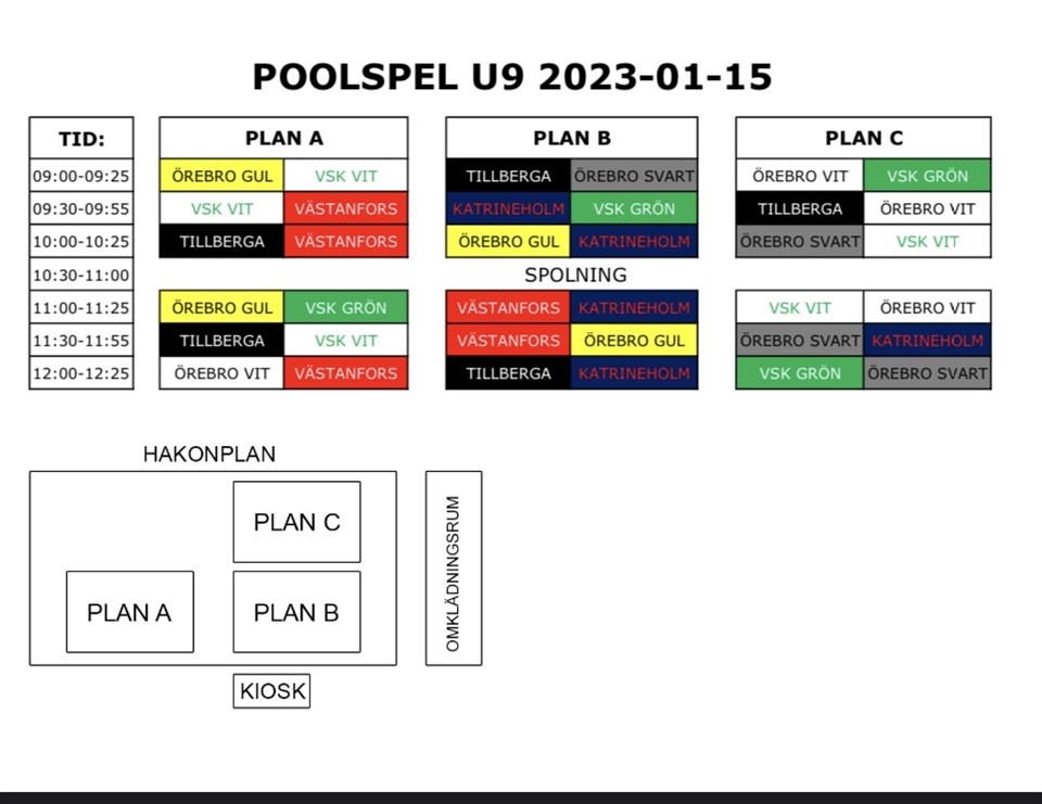 Heeej! Alla matcher kommer att spelas utomhus på Hakonplan alldeles intill bandyhallen ABB Arena syd. Samling i Västerås vid arenan senast 8.15 för direkt ombyte då matcherna startar 9.00 för alla våra tre lag. Det finns några barn i varje lag som stått i mål tidigare både på träning och match. Det betyder att de barnen behöver turas om att stå på söndag också. Tillberga som arrangerar poolspelet säger att det finns omklädningsrum att tillgå men att det kommer att bli trångt. Medtag extra ombyte då prognosen visar risk för nederbörd. Matcherna spelas 2x10 minuter. Lagindelningen... ÖSK gul Alfred E Arvid Ebbe Ivar Matteo Isac Pelle Thor ÖSK svart Charlie Liam Moa Samuel Sixten Thure GM Tilda Zac ÖSK vit Adam Alfred B Elin Knut Malte Simon Svante Ture L