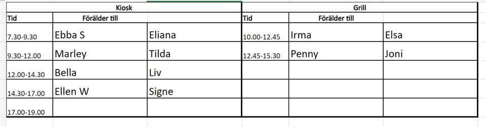 Grymt bra sista träning idag inför cupen på lördag, nu är vi taggade inför alla roliga matcher. Det var sista utomhusträningen för i år, efter cupen tar vi uppehåll några veckor innan vi drar igång inomhus (vi vet inte dagar än). Innan dess planerar vi också att styra upp någon slags avslutning för utomhussäsongen. Båda lagen har första match kl 9.00 och spelar vardera 4 matcher. Vi kommer samlas allihop kl 8.15 utanför omklädningsrummet där man kan hämta vatten. Då delar vi ut matchtröjor och går igenom vilka som spelar i respektive lag. Spelschemat har ni här: Örebro SK Ungdom 1 Skiljebo SK Svart lördag 09:00 Ekäng IP 5-5 6 Tillberga IK Fotboll Örebro SK Ungdom 1 lördag 10:30 Ekäng IP 5-5 4 Hammarby IF FF -3 Vit Örebro SK Ungdom 1 lördag 11:30 Ekäng IP 5-5 6 Örebro SK Ungdom 1 Vasalunds IF lördag 14:00 Ekäng IP 5-5 5 Örebro SK Ungdom 2 Trosa-Vagnhärad SK lördag 09:00 Ekäng IP 5-5 5 Örebro SK Ungdom 2 Rik Karlskoga lördag 10:30 Ekäng IP 5-5 6 Hammarby IF FF -3 Gr Örebro SK Ungdom 2 lördag 11:30 Ekäng IP 5-5 5 Skiljebo SK Gul Örebro SK Ungdom 2 lördag 13:00 Ekäng IP 5-5 6 Tänk på att ta med varma kläder (underställ kan vara skönt), benskydd och vattenflaska. Sedan har vi fortfarande några pass som behöver lösas i kiosk/grill. Se bilden, det är fyra personer som saknas. Skriv i kommentaren nedan vilket pass som du kan hjälpa till. Vi ses på lördag! F-F2015 4 okt 2023 3kommentarer