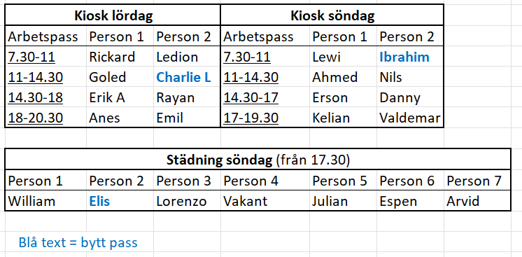 Hej, Här kommer ett uppdaterat schema. Vi behöver få in läsbekräftelse för: - Ledion - Rayan - Emil - Lewi - Erson - Nils - Danny - William - Julian Påminner om att eventuella byten kommuniceras i kommentarsfältet. F-P2015 Vit 1 apr 2025 0kommentarer