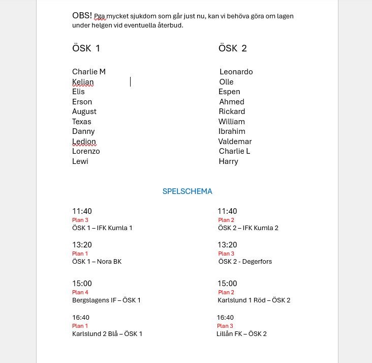 Hej! Som kommunicerats tidigare är vi ålagda att ställa upp med bemanning under innebandycupen 11-13 april. Vi har nu fått veta vårt lags ansvarsområde. Vi ska ansvara för kiosk i Änglandahallen lördag-söndag samt städning av samma hall söndag kväll. Detta deltagande är en obligatorisk uppgift för vårt lag och våra barns lagkassa kommer debiteras för de pass vi inte besätter. Vi har skapat ett schema och lagt in barnens namn men det är förstås vårdnadshavare eller annan vuxen som skall ta passet. Bekräfta i kommentarsfältet att ni tagit del av denna information. Tränarna har inte tilldelats något pass då de redan lägger så mycket tid på laget. Ni kan förstås byta pass med varandra men då görs det via kommentarsfältet. F-P2015 Vit 29 mar 2025 26kommentarer
