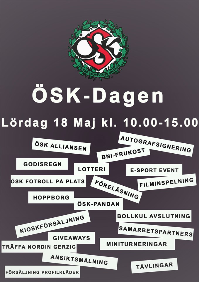 Varmt välkomna till ÖSK-dagen lördag 18 Maj kl 10.00-15.00 på EKängs IP Lördagen den 18 Maj arrangerar vi ÖSK-dagen på Ekängs IP. Vi vill med denna dag stärka banden mellan våra idrotter, lag, tränare/ledare, personal och föräldrar. Den här dagen är viktig för att påvisa vilken stor förening ÖSK Ungdom är. och vi vill att alla ska komma ner till Ekängs IP och ta del av detta fantastiska event och tillsammans stärka vårt varumärke och klubbkänsla. Vi ska alla vara stolta över att vara en del av ÖSK Ungdom och det finns ett stort värde i att vara en del av gemenskapen i vår ÖSK familj. Upplägget för dagen är: - Föreläsning för ledare - Miniturnering i fotboll, handboll och innebandy, där våra A-lags stjärnor kommer delta. För att anmäla ert lag, kontakta respektive Idrottsansvarig. - Våra samarbetspartners deltar i BNI-frukost (med start kl 08.00) samt på aktivitetsfältet med monter med tävlingar, giveaways etc. - Bollkul avslutning - E-sport event - ÖSK fotboll kommer med hela truppen, passa på att träffa Nordin Gerzic, få en autograf eller lira lite boll - Alliansföreningarna på plats under dagen. - Hoppborg, ansiksmålning och godisregn Varmt välkomna!