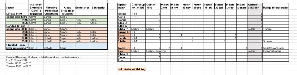 Hej, Nu finns det ett arbetsschema för USM den 9-10 oktober. Se bilden i detta meddelande, eller filen i mappen "Hösten 2021" under "Mer/Dokumnet". Vi är i Norrbyskolans idrottshall hela helgen. Vårt lag spelar 3 matcher - och det är 6 matcher totalt. Alla spelare har fått 1 eller 2 arbetspass som ska bemannas av en vuxen. Om det är någon tid som inte fungerar, så är det bara att ni byter mellan varandra. Meddela även mig, så ändrar jag namn i schemat. Övrig info: Camilla H fixar en tagg till hallen. Vi får ha kiosk (Erika fixar grunden till den) och vi kommer sända alla matcher via Solidsport (Pelle har bokat utrustning och skapat en kanal). För att vi ska veta att alla fått denna info, så vore det toppen om ni även lämnade en kommentar i chatten nedan när ni läst detta - och kikat på schemat! Hälsnignar Erika, Stellas mamma
