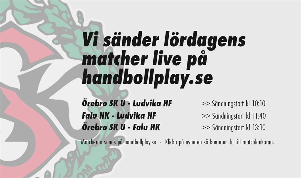 Lördagens matcher i Svealundskolan, Örebro kommer vi sända live på handbollplay.se (se länkar nedan). Här kan ni välja att bli månadsgivare till laget och kunna se alla grabbarnas matcher som vi sänder, eller köpa och se en enskild match. Match 1 Matchstart 10.15 ÖSK U - Ludvika HF sändingstart kl 10.10 Länk till matchen här! Match 2 Matchstart 11.45 Falu HK - Ludvika HF sändningstart kl 11.40 Länk till matchen här! Match 3 Matchstart 13.15 ÖSK U - Falu HK sändingstart kl 13.10 Länk till matchen här!