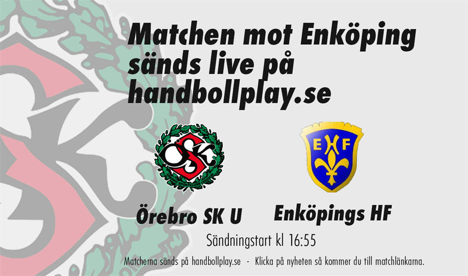 Söndagens hemmamatch i Änglandaskolan, Örebro kommer vi sända live på handbollplay.se (se länk nedan). Matchstart 17.00 ÖSK U - Enköpings HF sändingstart kl 16:55 Länk till matchen här! Här kan ni välja att bli månadsgivare till laget och kunna se alla grabbarnas matcher som vi sänder, eller köpa och se en enskild match.