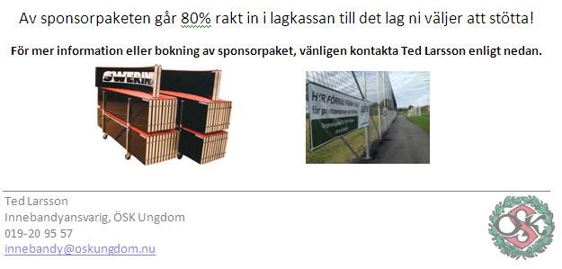 VAR MED OCH EXPONERA DITT FÖRETAG PÅ ÖSK UNGDOMS NYA INNEBANDYSARG! - OCH STÖTTA SAMTIDIGT DITT LAG I ÖSK UNGDOM! Inför innebandysäsongen 2013/2014 investerade ÖSK Ungdom i en splitterny innebandysarg för att ge våra ambitiösa ungdomar de allra bästa av förutsättningar för att utvecklas och trivas i sin idrott! Sargen är av typen SweRink Elite, vilket är samma sarg som används av de svenska Superligalagen samt under internationella toppturneringar! Sargen finns stationerad i Navets Bollhall där 18 ÖSK Ungdom-lag och över 320 barn tränar innebandy flera pass varje vecka! Dessutom kommer sargen användas under välbesökta Örebrocupen Innebandy där 250 lag från hela Sverige och ca 15 000 besökare lirar och njuter av innebandy under fyra fullspäckade dagar varje år! SPONSORPAKET 1: Pris: 10 000kr inklusive tryckkostnad. Sponsorn erhåller: • Logga på sargbit(dekal) på nya sargen i Navets Bollhall samt under Örebrocupen Innebandy. • Logga/budskap på tygbanderoll (300*90cm) på Ekängs IP, konstgräsplan. • Synlighet på ÖSK Ungdom Innebandy hemsida. • Synlighet bland hundratals besökare under ÖSK-dagen på Behrn Arena SPONSORPAKET 2: Pris: 6 000kr exklusive tryckkostnad. Sponsorn erhåller: • Logga på sargbit(dekal) på nya sargen i Navets Bollhall samt under Örebrocupen Innebandy. • Synlighet bland hundratals besökare under ÖSK-dagen på Behrn Arena Av sponsorpaketen går 80% rakt in i lagkassan till det lag ni väljer att stötta! För mer information eller bokning av sponsorpaket, vänligen kontakta Ted Larsson enligt nedan: Mail: marknad1@oskungdom.nu Tel: 019-20 95 57 PASSA PÅ!