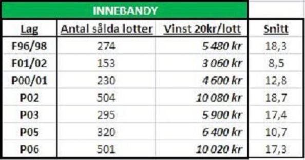Tack vare ett stort engagemang från drivna spelare, ambitiösa ledare och stöttande föräldrar är innebandyn just nu den idrott som växer klart snabbast i föreningen! Men, det är inte bara sportsligt innebandyn håller sig framme. Efter sammanställning av vinterns bingolottoförsäljning stoltserar vi tillsammans med 2277 sålda lotter och hela 45 540 kronor intjänat till de olika lagkassorna. Otroligt bra jobbat! Fortsätt ert starka arbete där ute! MVH Ted Larsson, Innebandyansvarig