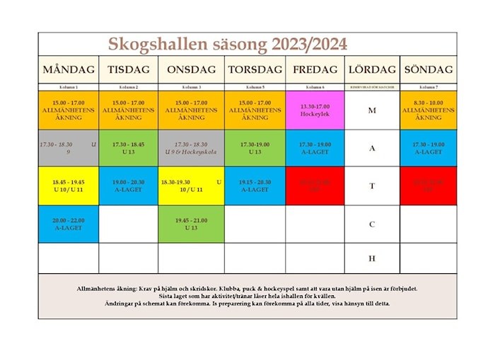 Allmänhetens åkning samt träningstider enligt schema. Vissa ändringar kan förekomma i samband med uthyrning och matcher, det finns information i kalendern på laget.se och uppsatta anslag vid ändringar. Friåkning som tidigare på övriga tider då hallen ej är bokad. När ni lämnar hallen plocka in puckar, småmålen mm som ni nyttjat för allas trevnad. Friåkning sker under eget ansvar, den som låser upp har ansvar för låsning och nedsläckning. A-lag Herrar ÖIF 18 sep 2023 0kommentarer