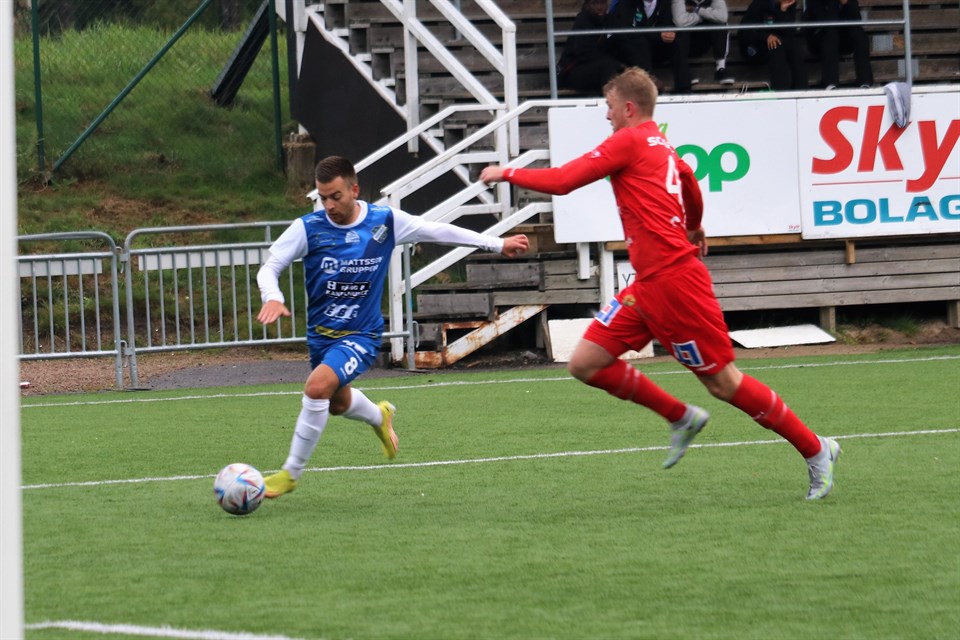 Oddevold gav aldrig Åtvidaberg någon chans till att ta poäng genom att man tidigt tog ledningen och sedan hade ett klart grepp om händelserna matchen igenom. Matchen slutade 3-0 (2-0) och Oddevolds mål gjordes av Oscar Iglicar, Elliot Stroud och Fredrik Sundström. På bilden ovan ser vi Oscar Iglicar i kamp med Åtvidabergs försvarare Adrian Petersson. Foto: Susann Sannefjäll. Båda lagen kom till spel med bra resultat från de senaste matcherna. Ett i botten kämpande Åtvidaberg hade två vinster och en oavgjord på de tre senaste, medan det i toppen jagande Oddevold hade fyra vinster och en oavgjord på sina fem senaste. Oddevold tog genast hand om dirigentpinnen och tryckte tillbaka Åtvidaberg långt ned mot det egna målet genom ett massivt övertag i bollinnehav. Det tog 25 minuter innan Åtvidaberg lyckades ta sig in på Oddevolds planhalva och etablera ett eget spel. Men innan dess hade Oddevold tagit ledningen och var också i startgroparna för att utöka den. Oddevold var i den sjunde minuten mycket nära, att återigen göra ett mål från långt håll när Alexander Almqvist avlossade ett lobbskott från mittlinjen mot Åtvidabergsmålet, där målvakten Hugo Claesson stod strax innanför straffområdeslinjen. Bollen seglade över en chanslös Claesson, men till hans lättnad gick den någon meter utanför hans högra stolpe. Men sju minuter senare var Almqvist även inblandad i det som skulle bli matchens första mål. 1-0 (14) En lång höjdboll från Alexander Almqvist på högerkanten från tiotalet meter in på egen planhalva nickades undan av en Åtvidabergsförsvarare strax utanför det egna straffområdet till Oscar Iglicar. Oscar tog emot bollen, tunnlade en motståndare och sköt från ca 30 meter ett skott, som via en försvarsrygg seglade över chanslöse målvakten Hugo Claesson och in i hans högra kryss. Oddevold fortsatte att föra spelet och knappa kvarten efter det första målet kunde man utöka sin ledning. 2-0 (28) Oddevold bröt ett uppspel från Åtvidaberg vid eget straffområde och bollen spelades till Jonas Emanuelsson, som befann sig mitt på egen planhalva. Han såg, att Elliot Stroud ville ha en boll i djupet och slog en underbar sådan med höger yttersida, som gick förbi Åtvidabergs mittback Mohammad Ahmadi och gjorde, att Elliot blev helt fri med den utrusande Hugo Claesson. Elliot rundade målvakten åt höger och rullade enkelt in bollen i det tomma målet. Under några minuter innan spelade 40 skapade Oddevold tre skapliga chanser, att göra ytterligare mål, men utan resultat. Först var Elliot Stroud nära, att få en fot på bollen i fritt läge framför mål efter ett inspel från höger från Axel Pettersson, sedan var Philip Engelbrektsson ytterst nära, att från någon meter stöta in bollen efter en lyftning från Adam Engelbrektsson och till sist sköt Axel Pettersson ett bra skott från 17-18 meter på halvvolley, som Hugo Claesson räddade. När den andra halvleken började var det Åtvidaberg som var tvingade, att förändra sitt spel för att ha någon chans till poäng och det märktes direkt, att man bestämt sig för att inta en mer offensiv hållning i matchen. Vi visste ju, sedan matchen i våras, att de är ett bollskickligt lag och det visade man nu prov på. Problemet var, att man hade oerhört svårt att ta sig fram till målchanser och det enda i den kategorin var vid två tillfällen där tekniske yttern till vänster, Gustav Ryberg, var inblandad. Men i övrigt var det Oddevold som skapade mest och man spelade sig till två bra möjligheter till ett tredje mål innan det slutligen kom. Vid båda gångerna var det Axel Petterssons fötter som var sist på bollen. Först blev han snyggt frispelad till vänster i straffområdet i den 62:a minuten av Oscar Iglicar, men Hugo Claesson räddade med en fin fotparad. På passning från Kenan Mehovic en dryg minut senare curlade han bollen från straffområdeslinjen, men Hugo Claesson sträckte ut och kunde tippa till hörna. Med dryga kvarten kvar täcktes ett skott från Axel Pettersson ut till en hörna och halvminuten senare var matchen avgjord. 3-0 (74) Emil Niklasson hade varit på planen i blott en minut, när han gick ut för att slå hörnan från vänster. I trängseln framför mål ”armade” sedan Fredrik Sundström med ryggen mot mål in bollen nära målvaktens vänstra stolpe. Det hopp om poäng Åtvidaberg närt under den andra halvleken försvann helt efter detta mål och avslutningen av matchen blev från båda lagen mest en längtan efter just det. När klockan stod på 92.58 blåste domaren av matchen. Sammanfattning Det var en imponerande väl genomförd match av Oddevold. Man tog direkt tag i matchen och hade full kontroll på allt skeende från första till sista minut. Det tidiga ledningsmålet gjorde också, att man fick den trygghet som gör att man kan spela mer avslappnat. Att gå ut och vinna så kallade enkla matcher är svårare än de flesta tror. Det är lätt att slappna av och ha dåligt fokus på noggrannhet och uppgjord matchplan. Av detta såg vi intet i dagens match och det känns som en styrka och trygghet, när vi nu går in i de sista avgörande matcherna. Vi behöll också det fina försvarsspel vi haft hela året och som blivit ännu bättre den senaste tiden, där vi i de fyra senaste matcherna hållit nollan och på de sex senaste tagit 16 poäng med målskillnaden 12-2. En annan viktig egenskap, som man ofta bortser ifrån, är att vi drar på oss få varningar. På de fem senaste matcherna har vi endast ådragit oss en och på de 24 spelade matcherna har vi fått 31, vilket betyder i genomsnitt 1,3 per match. I dag var det inte någon av våra spelare som domaren behövde skriva upp. I ett jämnt manskap, där alla skötte sig bra, vill jag ändå lyfta fram två spelare: Kenan Mehovic, som hela tiden utmanade genom offensiva löpningar och också tog ett stort defensivt ansvar, och Oscar Iglicar, som tog med sig d