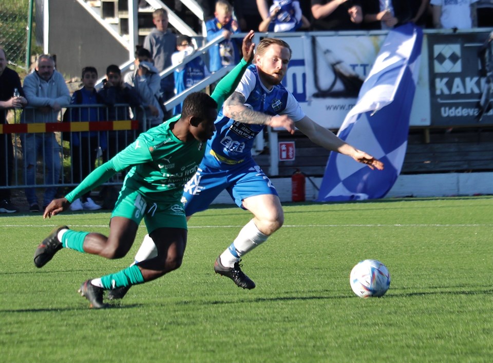 Oddevold var det något bättre laget i det sedan länge emotsedda derbyt mot Ljungskile, men det blev mer en tillställning fylld av kamp än av målchanser. Matchen slutade 0-0. På bilden ovan ser vi Jonas Emanuelsson i kamp med Ljungskiles Uba Charles Nwokoma. Foto: Susann Sannefjäll. Förutsättningarna inför matchen kunde verkligen inte ha varit bättre – båda lagen låg i toppen av tabellen, där ett av lagen skulle gå upp i serieledning efter matchen, lagen hade gjort mest och näst mest mål i serien, Oddevold hade släppt in näst minst mål och Ljungskile femte minst antal mål, solen kunde inte ha skinit starkare och mer intensivt, det var vindstilla och framför allt var matchen slutsåld. Visserligen gick den inte på Rimnersvallen, men ordet slutsåld har jag aldrig tidigare behövt använda i mina många matchrapporter. Supportrarna från båda lagen hade också laddat mer än någonsin tidigare, vilket satte extra krydda på anrättningen, även om jag inte gillade allt de gjorde. Mot allt detta glimmer skall man då ställa vad det hela handlade om: lagens prestation under 90 minuter och då får man nog konstatera, att spelet inte lyckades nå samma höga nivå. Spänningen, intensiteten och ovissheten fanns där förvisso matchen igenom, som den nervpirrande ingrediens som hör ett riktigt derby till, men tyvärr vann låsningarna över lösningarna på planen denna gång. Direkt från start såg man, att Ljungskile valt att prioritera defensiven. Man valde att börja försvara sig vid mittlinjen och hade placerat ut en ansenlig del av laget runt det egna straffområdet. Oddevolds hittills 19 seriemål fick inte bli fler. Oddevold hade också i den första halvleken ett stort bollövertag och var det lag som skapade flest målchanser, även om Ljungskile var först ut i det avseendet. Det skedde i den sjunde minuten när Anton Henriksson nickskarvade bollen fram till Oskar Lindberg, som sprungit sig fri bakom Oddevolds backlinje. Hans lyftning från 7-8 meter gick förbi utrusande Oscar Ekman, men turligt nog också utanför stolpen. Den höga och intensiva pressen från Oddevold gav ur målchanssynpunkt högre utdelning än det stora övertaget i bollinnehav. Vid två tillfällen resulterade det i bra möjligheter till ledningsmål. Först i den 14:e minuten när Kenan Mehovic fick fritt skottläge från strax utanför straffområdeslinjen, men då kunde Oliver Bergman boxa bort bollen. Vid det andra tillfället, i den 39:e minuten, frispelade Imer Beqiri Oscar Iglicar, men återigen kunde Bergman rädda, denna gång rusade han ut och styrde undan bollen med en fotparad. Ett annat bra läge att spräcka matchens målnolla fick Kenan Mehovic efter att Emil Niklasson nickat fram bollen efter hörna. Bollen landade lite överraskande snabbt framför fötterna på Kenan vid målområdeslinjen, så lyftningen i fritt läge gick över målet. I övrigt var det mycket kamp, både i ett individuellt perspektiv och ett där Oddevolds offensiv ställdes mot Ljungskiles defensiv. En defensiv som var väl samlad och väl organiserad, vilket gjorde det svårt att hitta ytor och öppningar för Oddevold, så i paus var det mållöst. Den andra halvleken blev lite annorlunda än den första, då Ljungskile i vilan beslutat sig för, att ta sig an Oddevold betydligt högre upp i planen, vilket gjorde att bollinnehavet fick en jämnare fördelning. Efter tio minuters spel fick Oddevold matchens bästa chans efter att Oscar Iglicars skott från högerkanten snyggt räddats av Oliver Bergman. Returen gick till Jonas Emanuelsson, som befann sig några meter till höger om straffpunkten, men skottet efter uppstuds gick några decimeter utanför Bergmans vänstra stolpe. Strax efteråt bytte Ljungskile in Linus Tornblad och Ken Akamatsu och det dubbelbytet förändrade ganska omgående matchbilden. Ljungskile fick in mer fart i spelet och började hota på ett tydligare sätt än tidigare, även om det inte ledde fram till några riktigt klara målchanser. Farligast blev det när Tornblad arbetade sig in från vänsterkanten mot mitten i höjd med straffområdet och sköt, men skottet fick ingen ordentlig fart och togs enkelt om hand av en välplacerad Oscar Ekman. Att Ljungskile lyfte upp spelet fick också den konsekvensen, att det gav Oddevold större ytor när man erövrat bollen. Man fick till en del skapliga omställningslägen, men de kunde tyvärr inte förvandlas till några riktigt heta chanser mot ett stabilt Ljungskileförsvar. När domaren blåste av matchen med matchuret på 49.58 var det inte helt överraskande att inget av lagen lyckats göra något mål. Oddevold hade mer boll och skapade flest och bäst chanser, men Ljungskile försvarade sig väl med en säker målvakt i Oliver Bergman och där de båda mittbackarna Ilir Berisha och Daniel Garcia Olsson styrde försvarsspelet. Uba Charles Nwokoma på det inre mittfältet jobbade över stora ytor och var Ljungskiles bästa spelare. På nytt höll Oddevold nollan, den fjärde på sju matcher, så försvarsspelet var återigen bra både över hela plan och hos försvaret. Individuellt i en väl fungerande lagmaskin vill jag från dagens match lyfta Kenan Mehovic, Jonas Emanuelsson och Filip Karlin. Redan kommande lördag är det dags för ny hemmamatch, då Tvååkers IF kommer på besök till Fridhemsvallen i en match som börjar kl 13.00. Laget Oscar Ekman Philip Engelbrektsson-Fredrik Sundström-Adam Bergholtz Filip Karlin (82)-Jonas Emanuelsson-Kenan Mehovic-Imer Beqiri (72)-Emil Niklasson (79) Carl Lext-Oscar Iglicar Ersättare Armin Ibrahimovic, MV (-) Gustav Kjellström (72) Filip Schöön (79) Adam Stroud (82) Carl Ådahl (-) Pontus Johansson (-) Axel Pettersson (-) Varningar Oddevold: Kenan Mehovic (87). Ljungskile: Ken Akamatsu (63), Fredrik Martinsson(81), Samuel Olsson (90+5). Domare HD: Fikret Buqa, Borås AD 1: Shahab Lazar, Göteborg AD 2: Emre Akan, Göteborg Publik 1.532