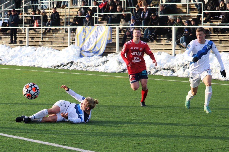 Oddevold fick en nyttig påminnelse om sin egen sårbarhet, då man förlorade för första gången i år mot Div 2-laget Räppe GoIF. Matchen slutade 1-3 (0-1) och Oddevolds mål gjordes av Kenan Mehovic. På bilden ovan ser vi Jonas Emanuelsson ladda för skott i början av matchen med Emil Niklasson som betraktare i bakgrunden. Foto: Susann Sannefjäll. Oddevold kom till den femte träningsmatchen med idel segrar i bagaget för ett möte med ett lag som förmodligen ingen av våra spelare mött tidigare, Räppe GoIF från Växjö, som tagit sig upp till Uddevalla för att vässa formen inför sin säsong i Div 2. Under i stort sett alla matcher under Rikard Nilssons drygt tvååriga ledning har Oddevold valt att spela med laget i en 3-5-2-uppställning, om än i lite olika variationer. I dag var det dock inte så, utan han valde i stället fyrbackslinje och 4-3-3. Inte oväntat tog Oddevold hand om bollinnehavet redan från start och Räppe fick försvara sig med början en bit in på egen planhalva och med de flesta av spelarna utplacerade runt det egna straffområdet. Några målchanser ledde inte det stora övertaget i boll till, men när Räppe efter tio minuter varit tvungna att byta två av sina spelare trodde man nog lite till mans, att det första hemmamålet snart skulle komma. Det gjorde det inte. När Anton Andersson i den 20:e minuten mycket bryskt och onödigt tacklade sönder Emil Niklasson ledde det till, att Anton blev utvisad och Emil tyvärr utbytt. Eftersom man i träningsmatcher numera inte får ersätta utvisade spelare, som flera i publiken trodde och tyckte man borde få, innebar det att Oddevold därmed var en man mer på plan. Men inte ens detta bakslag för Räppe gjorde, att Oddevold skapade så många målchanser under den första halvleken. Det såg ut som om den skulle sluta mållös, när gästerna i näst sista minuten överraskande tog ledningen. 0-1 (44) Efter en högerhörna boxade Oscar Ekman ut bollen, men vid straffområdeslinjen kunde Filip Jeppsson ta emot bollen på bröstet och sen lyfta den över alla spelare och in i mål. Bortaledning i paus, men med mindre än två minuter in i den andra halvleken var ställningen i matchen utjämnad. 1-1 (47) Jonas Emanuelsson släppte bollen i sidled åt vänster på straffområdeslinjen och därifrån sköt Kenan Mehovic ett skott, som via en försvarsfot helt ställde den egna målvakten. Oddevold hade nu nästan en hel halvlek på sig, att säkra ytterligare en seger, men trots ett mycket stort spelövertag lyckades man inte få till ett andra mål. Man skapade visserligen ett par chanser, men oftast gick inte inspelet, inlägget eller den sista passningen till rätt spelare, utan ett frenetiskt kämpande Räppe kunde under återstoden av matchtiden hålla sitt mål fritt från påhälsning. I stället var Räppe farliga på sina omställningar och framför allt när snabbe Johnbosco Kalu fick bollen ställde han till med bekymmer för Oddevoldförsvaret. Det var också han som på nytt skulle ge smålänningarna ledningen bara ett par minuter efter Oddevolds kvittering. 1-2 (50) Räppe erövrade bollen vid mittlinjen och sedan fick Kalu den och avancerade mot Oddevolds mål och ett backande försvar, petade bollen till vänster och sköt ett skott med vänstern från straffområdeslinjen rakt upp i Magnus Lundbergs högra kryss. Matchbilden fortsatte att vara densamma och med 20 minuter kvar kunde Räppe fastställa slutresultatet. 1-3 (70) Räppe erövrade bollen på mittplan och bollen gick till Johnbosco Kalu, som i sin tur spelade den snett framåt till Emil Andersson Barck. Från ca 20 meter sköt Andersson Barck ett skott efter backen, som gick i mål nära Magnus Lundbergs vänstra stolpe. Det var inte ridå ned för Oddevold, men man var helt enkelt inte fullt påkopplade och försöken till reducering och i förlängningen kvittering, blev egentligen aldrig riktigt farliga. När klockan stod på 92.07 blåste domaren Haris Memisevic av matchen. Nästa träningsmatch spelas på bortaplan mot våra seriekonkurrenter Tvååkers IF den 5 mars kl 13.00 på Övrevi C. Målen 0-1 (44) Filip Jeppsson 1-1 (47) Kenan Mehovic (Jonas Emanuelsson) 1-2 (50) Johnbosco Kalu 1-3 (70) Emil Andersson Barck Laget Oscar Ekman (46) Emil Niklasson (23)-Philip Engelbrektsson (71)-Fredrik Sundström (71)-Elliot Stroud Imer Beqiri-Jonas Emanuelsson-Kenan Mehovic Axel Pettersson-Gustav Kjellström (71)-Carl Lext Ersättare Magnus Lundberg, MV (46) Filip Schöön (23) Adam Bergholtz (71) Pontus Johansson (71) Oscar Iglicar (71) Carl Ådahl (-) Jonatan Leje Bjelkholm (-) Utvisning Oddevold: - Räppe: Anton Andersson (20) Varning Oddevold: Kenan Mehovic (61). Räppe: - Domare HD: Haris Memisevic, Göteborg AD 1: Shahab Lazar, Göteborg AD 2: Peshang Salih, Göteborg Publik 110