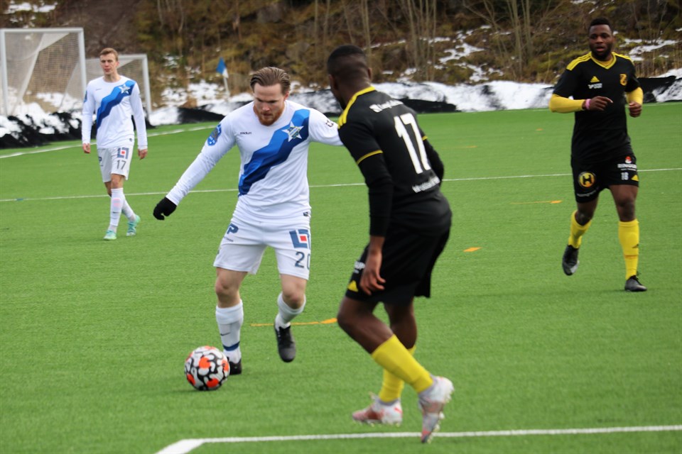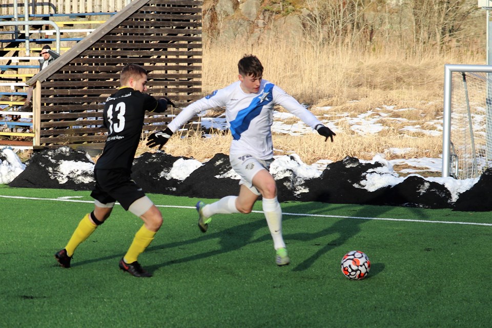 Oddevold höll oavgjort till pausvilan, men i den andra halvleken kunde Tvååker helt ta över matchen efter att Oddevold åkt på en utvisning. Matchen slutade 0-3 (0-0). På bilden ovan ser vi Axel Pettersson i en närkamp med en Tvååkerspelare. Foto: Susann Sannefjäll. Tvååker bjöd på härligt väder mitt på lördagen med en sol som tittade fram då och då och så var det i stort sett vindstilla på ett Övrevi, som oftast ute i det öppna landskapet besöks av starka vindar. På planen var dock inte värdarna överdrivet angelägna att bjuda på något. Oddevold kom till spel för andra matchen i rad med en 4-3-3-uppställning, där den första halvleken var jämn och intensiv med ett litet spelövertag för Tvååker. Riktiga målchanser uteblev egentligen för båda lagen, men hemmalaget vaskade fram två halvchanser under de sista minuterna genom forwarden Rasmus Andersson. Första nickade han i fritt läge bollen rakt på Oscar Ekman och sedan sköt han över i bra position efter inspel från högerkanten. Under öppningskvarten i den andra halvleken skapade Tvååker två skapliga lägen och Axel Pettersson hade ett fint genombrott, som dock målvakten kunde avstyra. Så kom då det slarviga uppspelet från Oddevold sida, som ledde till att Elliot Stroud fick sin andra varning när han tryckte ned den framstormande Tvååkerspelaren strax utanför straffområdet. Från detta ögonblick tippade matchen helt och hållet över till Tvååker. 1-0 (59) Den påföljande frisparken lyfte Anton Nilsson över muren och i mål. Ledningen utökades bara åtta minuter senare. 2-0 (67) En vänsterhörna nickskarvades vidare till Johan Persson vid den bortre stolpen och han kunde helt fri från nära håll slå bollen i mål. Tvååker hade stort bollinnehav och spelet var för det mesta förlagt till Oddevolds planhalva, men man skapade inte så många heta chanser. Oddevold lyckades skapa en skaplig chans när Axel Pettersson prickade målvakten Anton Anderssons vänstra stolpe ur en snäv vinkel. Det blev i stället en tredje fast situation som ledde till lika många mål för värdarna och fastställt slutresultat. 3-0 (83) En låg hörna från höger klackades vidare till Wilhelm Åkervall/Stenqvist i högen av spelare mitt framför mål och från målområdeslinjen sköt han bollen i mål. Det blev stora siffror till slut, men det räcker att man tappar uppmärksamheten bara för ett kort ögonblick när man möter lag av Div 1-klass och så kan man åka på ett baklängesmål. Tre gånger gjorde vi det i dag och det räckte för förra årets topplag i den här matchen. Nästa träningsmatch spelas hemma på Thordéngården lördagen den 12 mars mot Div 3-laget Vinbergs IF. Avspark sker kl 12.00. Målen 1-0 (59) Anton Nilsson 2-0 (67) Johan Persson 3-0 (83) Wilhelm Åkervall/Stenqvist Laget Oscar Ekman Philip Engelbrektsson-Adam Bergholtz (66)-Fredrik Sundström-Elliot Stroud Imer Beqiri-Jonas Emanuelsson (83)-Kenan Mehovic Axel Pettersson-Gustav Kjellström (62)-Carl Lext (66) Ersättare Armin Ibrahimovic, MV (-) Magnus Lundberg, MV (-) Filip Schöön (62) Pontus Johansson (66) Oscar Iglicar (66) Carl Ådahl (83) Sebastian Carhed (-) Utvisning Tvååker: - Oddevold: Elliot Stroud lindrig (35) och (58). Varning Tvååker: Marcus Jönsson (51). Oddevold: - Domare HD: Abdinaser Bashir. Angered AD 1: David Carlsson, Varberg AD 2: Albin Osdautaj, Varberg Publik 75