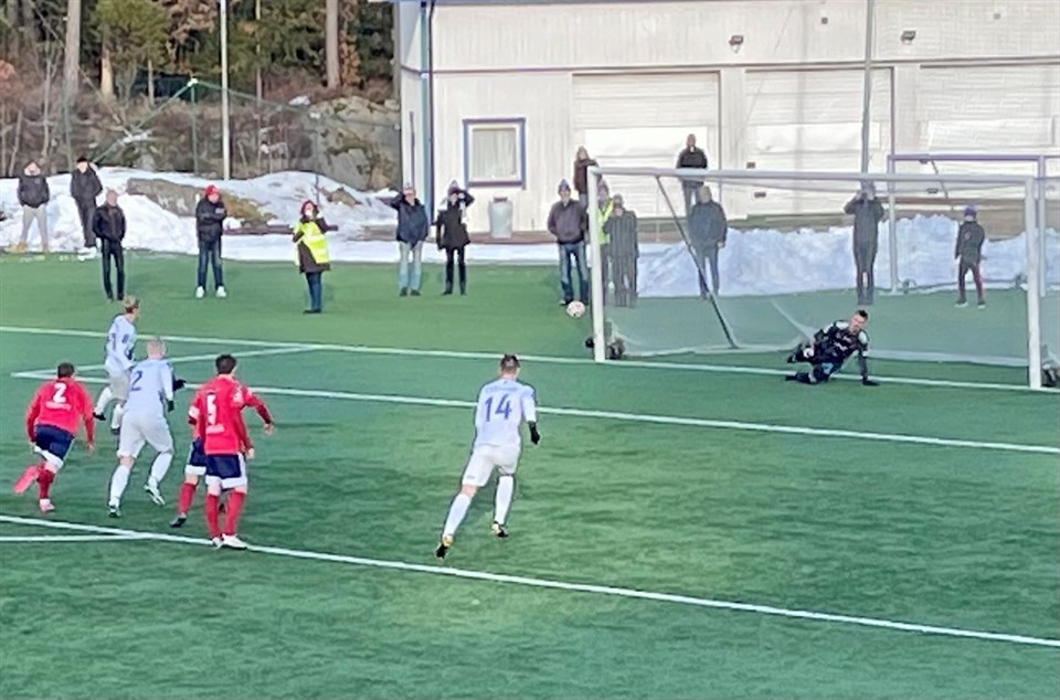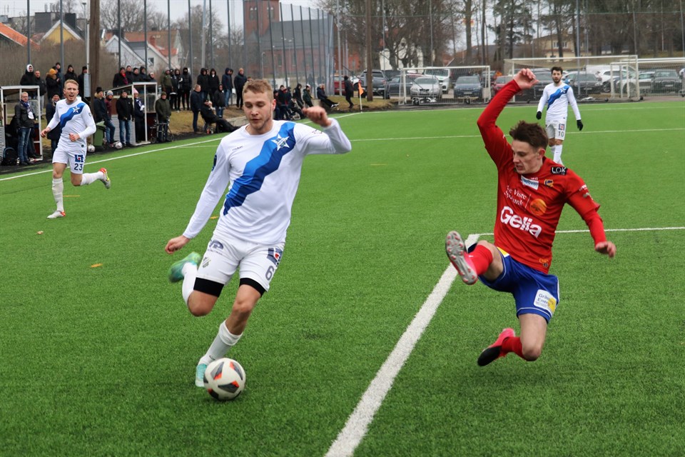 Oddevold fortsatte i dagens match sin segersvit i träningsmatcherna när man besegrade IK Gauthiod. Matchen slutade 0-3 (0-2) och Oddevolds mål gjordes av Imer Beqiri, Jonas Emanuelsson och Elliot Stroud. På bilden ovan ser vi Adam Stroud med bollen framför den stora tillresta Oddevoldklacken innehållande bland annat Torbjörn Olsson med den jättelika Oddevoldfanan och undertecknad. Foto: Susann Sannefjäll. Det var så kyligt och blåsigt, att publiken huttrade. Man hoppade och var i rörelse för att införskaffa värme åt kroppen. För Oddevold var det alltså tredje matchen, medan det för Gauthiod var årspremiär. Dessutom kom man till spel med en ny huvudtränare, Andreas Wingård, och med en till hälften ny spelartrupp. Oddevold greppade redan från matchstart taktpinnen och lånade inte ut den till de rödklädda motståndarna under hela matchen. Värdarna valde, att direkt ligga lågt i planen och bilda en tät defensiv framför den egna målvakten. Utgångspunkt för att inleda bollerövring låg den mesta delen av matchen tio meter in på egen planhalva. Ett bollsäkert Oddevold hade dock svårigheter, att hitta öppningar i ett välorganiserat och starkt kämpande hemmalag, så målchanserna under matchen blev inte så många. Första målchansen fick debuterande Jonas Emanuelsson, som i den 14:e minuten kunde fått en flygande start i sin nya förening, men den hårda nicken från straffområdeslinjen räddades snyggt av målvakten Marcus Berg. I stället var det Imer Beqiri, som skulle inleda målskyttet på Lunnevi. 0-1 (28) På ett fint inlägg från Elliot Stroud kunde Imer Beqiri lugnt och säkert bredsida in bollen från nära håll. Knappa kvarten efter första målet fick ändå Jonas Emanuelsson göra mål i sin debutmatch för Oddevold. 0-2 (41) Kenan Mehovic spelade in bollen från vänster och Jonas Emanuelsson stoppade den 22-23 meter från mål och sköt snabbt därefter ett lobbskott, som seglade över Berg i hemmaburen. Mitt i den andra halvleken gjorde Oddevold matchens sista mål. 0-3 (69) Elliot Stroud tog sig in i straffområdet till vänster och förbi sin motståndare och avslutade med ett tungt vänsterskott, som Marcus Berg inte hann med att styra undan. De båda lagen hade var sin jättechans när det stod 0-3, att utöka ”målandet” i matchen, men vid båda tillfällena gick styrningen resp skottet utanför mål från nära håll. Det var en stabil insats från Oddevold, där man hela tiden hade kontroll på skeendet och styrde matchen dit man önskade. Däremot hade man lite svårt, trots ett stort bollinnehav, att skapa målchanser när man kom ned mot Gauthiods straffområde. I nästa träningsmatch möter vi Vänersborgs IF på Fridhemsvallen i Uddevalla lördagen den 19 februari kl 14.00. OBS! Ny matchplan och ny tid för avspark! Målen 0-1 (28) Imer Beqiri (Elliot Stroud) 0-2 (41) Jonas Emanuelsson (Kenan Mehovic) 0-3 (69) Elliot Stroud (Carl Lext) Laget Armin Ibrahimovic (46) Philip Engelbrektsson (46)-Fredrik Sundström-Adam Bergholtz Adam Stroud (66)-Kenan Mehovic-Jonas Emanuelsson (46)-Imer Beqiri (76)-Elliot Stroud (81) Gustav Kjellström (66)-Carl Lext Ersättare Oscar Ekman, MV (46) Filip Schöön (46) Axel Pettersson (46) Filip Karlin (66) Calle Ådahl (66) Sebastian Carhed (76)) Jonatan Leje Bjelkholm (81) Varningar Gauthiod: Robin Särud (89). Oddevold: Imer Beqiri (37). Domare HD: Niclas Karlsson, Göteborg AD 1: Filiph Bergstedt, Trollhättan AD 2: Jon Eriksson, Lidköping Publik ca 80